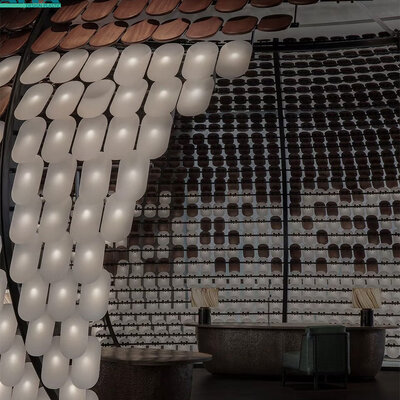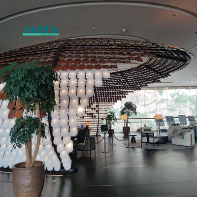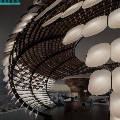 Praktisch en esthetisch:Acryl's hoge slagvastheid en makkelijke reiniging maken het ideaal voor hotellobbies met veel verkeer.Het lichtgewicht maakt het mogelijk om grootschalige ophanginstallaties zonder complexe dragende structuren te installerenDe ingebouwde verlichtingseenheden maken het mogelijk om de helderheid aan te passen aan de verschillende behoeften van de omgeving.